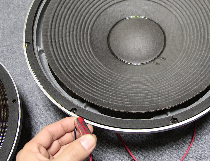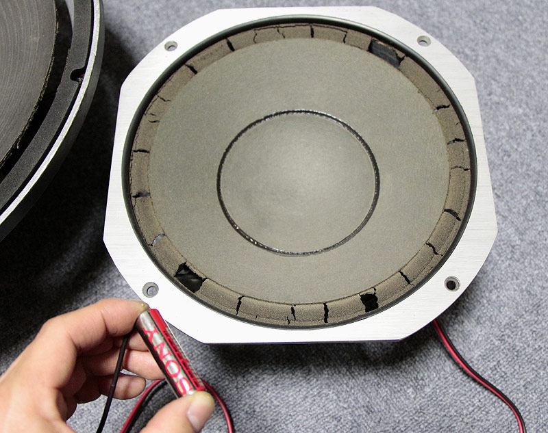 「赤」に乾電池のプラス「黒」にマイナスを繋げると、引っ込みますねぇ。(くれぐれも弱った電池です。ツイーターやダイヤフラムに試すと壊れますのでやらないように)