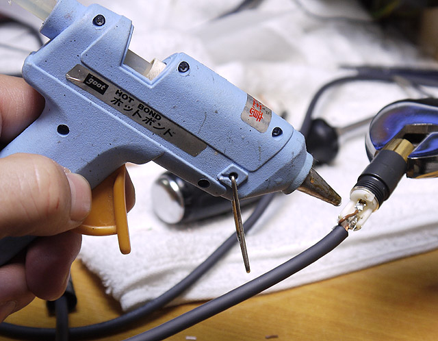 ハンダ後にはこのホットボンドでハンダ接続周辺をコートします。
